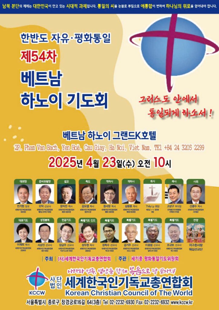 54차 베트남 하노이 기도회 SBSWEB / 2025-04-14 그리스도 안에서 통일되게 하소서베트남 하노이 그랜드 K호텔2025년 4월 23일 오전 10시 Categories: 커뮤니티